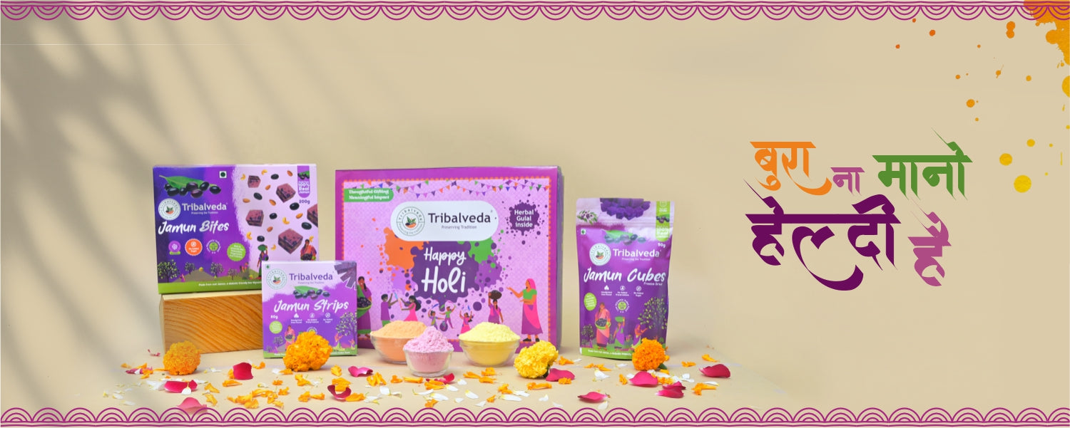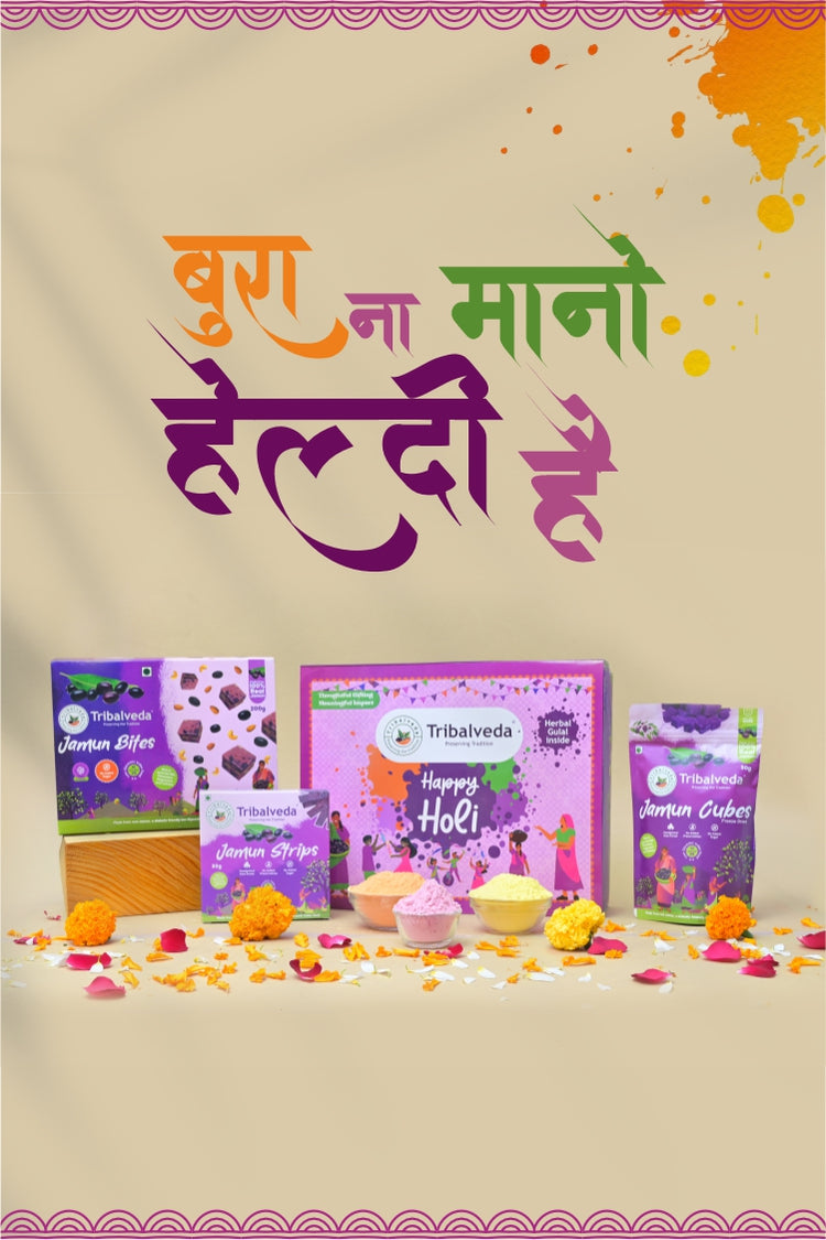 Celebrate a Purple Holi with 100% natural Jamun treats and herbal gulal. Pure forest goodness with no added sugar.